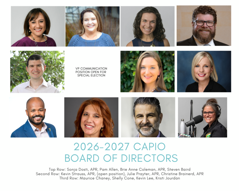 Note: A special election will be held for the VP Communications position due to the movement to President-Elect for Pam Allen. Nominations for this position will be open for two weeks through April 17, after which we will have a special election. Submit a nomination here!The 2026-2027 CAPIO board members include: