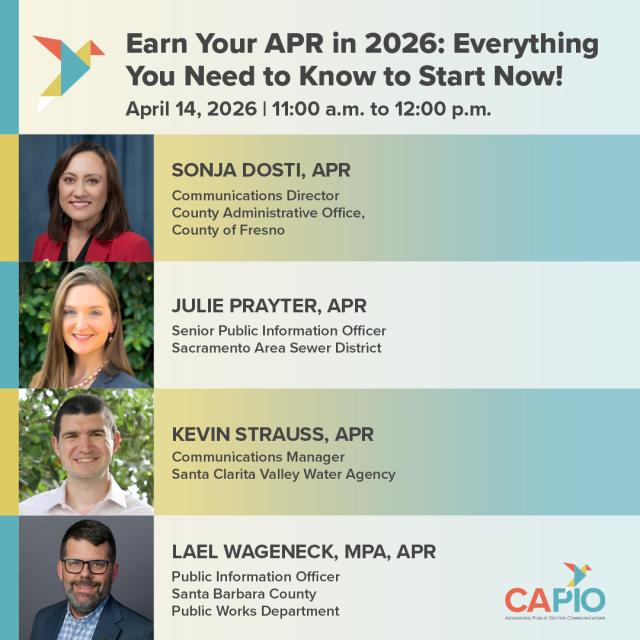 During CAPIO’s 2023 State of Communications webinar, attendees will learn about key issues facing California communicators and learn about CAPIO’s areas of focus for 2023 from CAPIO’s President Erin Morales and CAPIO President-Elect/Treasurer Lael Wageneck, APR.
