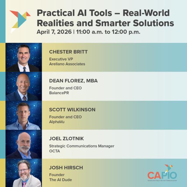 Dean Florez brings a unique policymaker’s perspective on how regulation, technology, and innovation shape public communication. Scott Wilkinson, founder of AlphaVu, uses AI and data analytics to help organizations better understand and connect with their audiences. Chester Britt (CAPIO member) draws on three decades of public engagement experience to guide agencies in building stronger community connections through tech-driven outreach. Joel Zlotnik, Strategic Communications Manager at OCTA, combines strategic messaging with digital platforms and analytics to drive tech-enabled public engagement and innovative communication strategies. Josh Hirsch (CAPIO member), founder of The AI Dude, is a respected voice in this emerging field and is frequently invited to speak at conferences and workshops about the strategic integration of AI.
